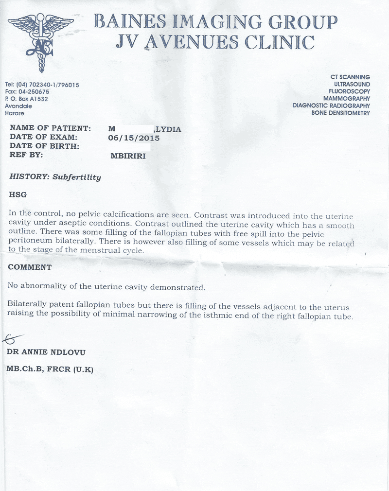 In October 2011 I however conceived having done nothing, though unfortunately I lost the pregnancy at 6 months. I then knew I could conceive anytime and started trying again in 2014 but to no avail. In 2015 I was sent for another HSG which I refused saying I had conceived before and at least one tube was open. However, after the doctor ascertained that I had no fibroids and was ovulating normally, he insisted on the x ray and this is what the report read on 20th March 2015: Positive contrast outlines a normal endometrial cavity. There are no significant persistent filling defects. There is progressive filling of the right Fallopian tube. It ends blindly. There is no peritoneal contrast spill. The left tube is not seen.